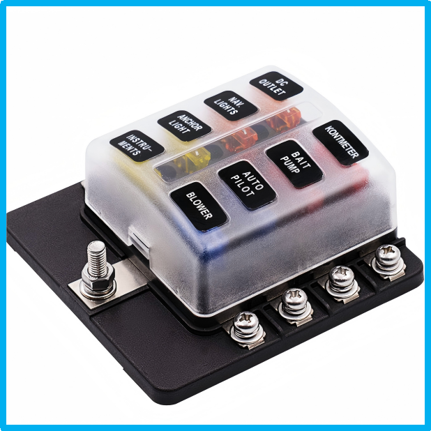 2.产品1进8出设计,可以直接一根线连接电瓶正极,一根线连接保险丝盒,再由保险丝盒分出6位端子分别连接不同的用电器正极,非常简单方便。