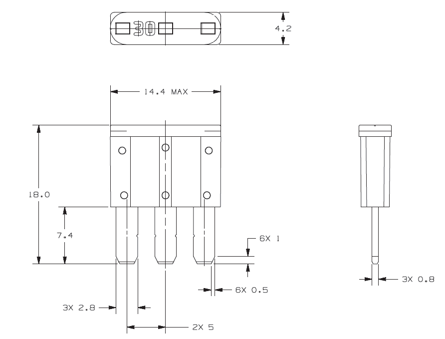The MICRO3™ Fuse has 3 terminals and 2 fuse elements with a common center terminal.