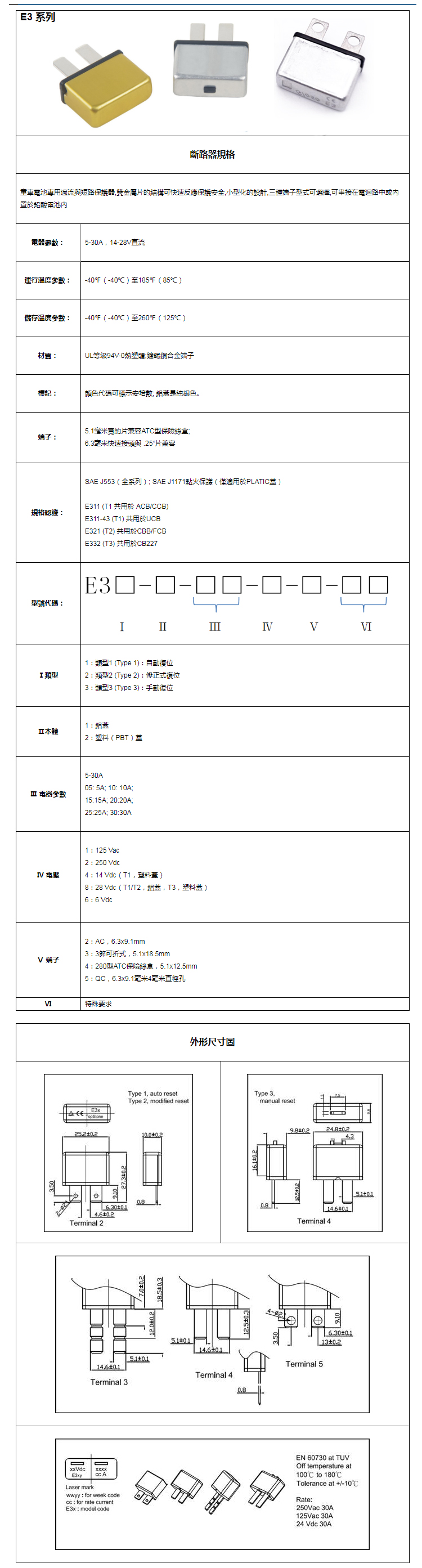 SAE J553(全系列); SAE J1171点火保护(仅用于PLATIC)