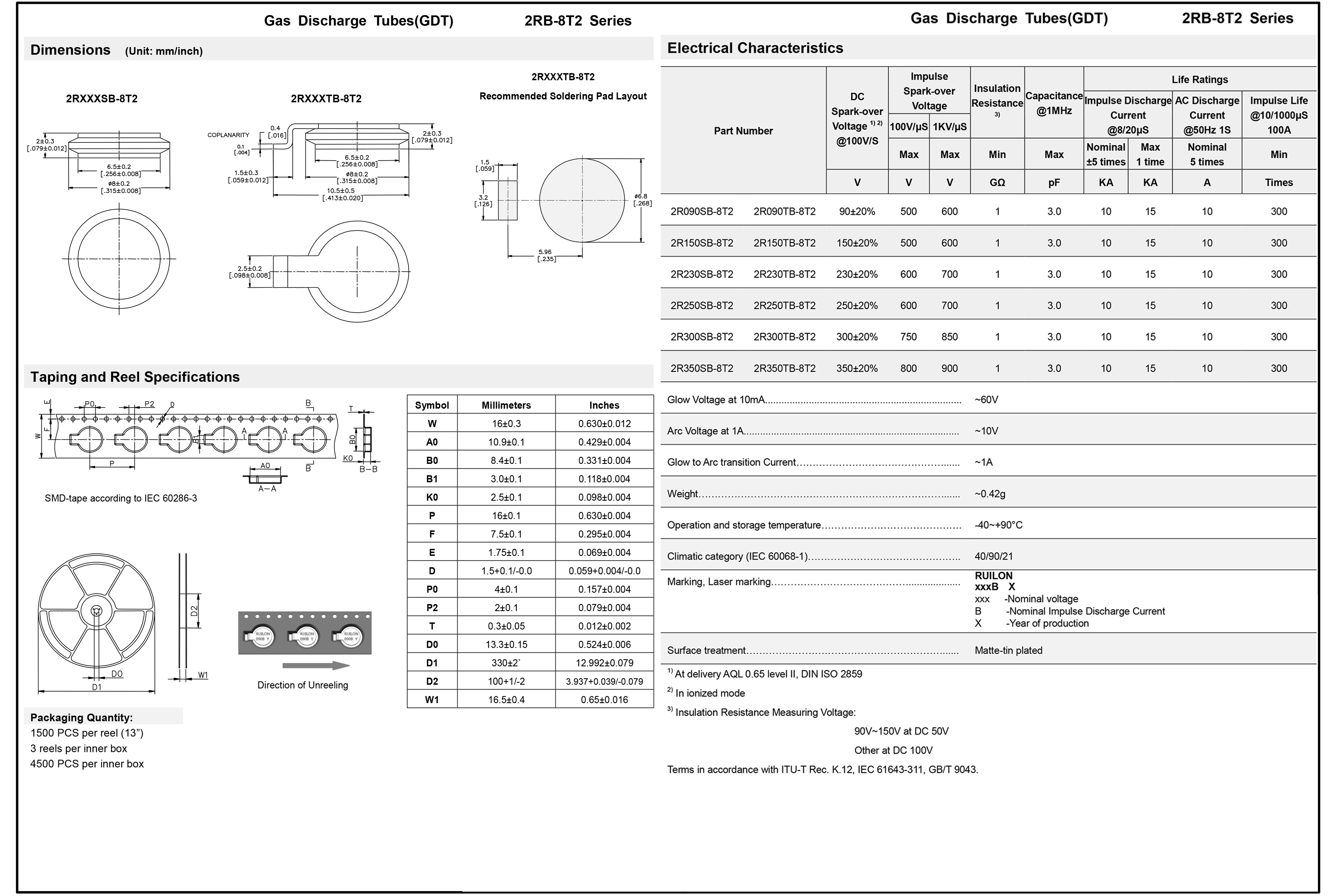2RB-8T2气体放电管特征:对快速上升瞬变的反应极好,稳定击穿电压8/20μ脉冲电流容量:10KA,非放射性超低电容(<3.0pF),无铅柔顺符合RoHS和REACH标准 尺寸:8mm*2mm储存和操作温度:-40~+90℃