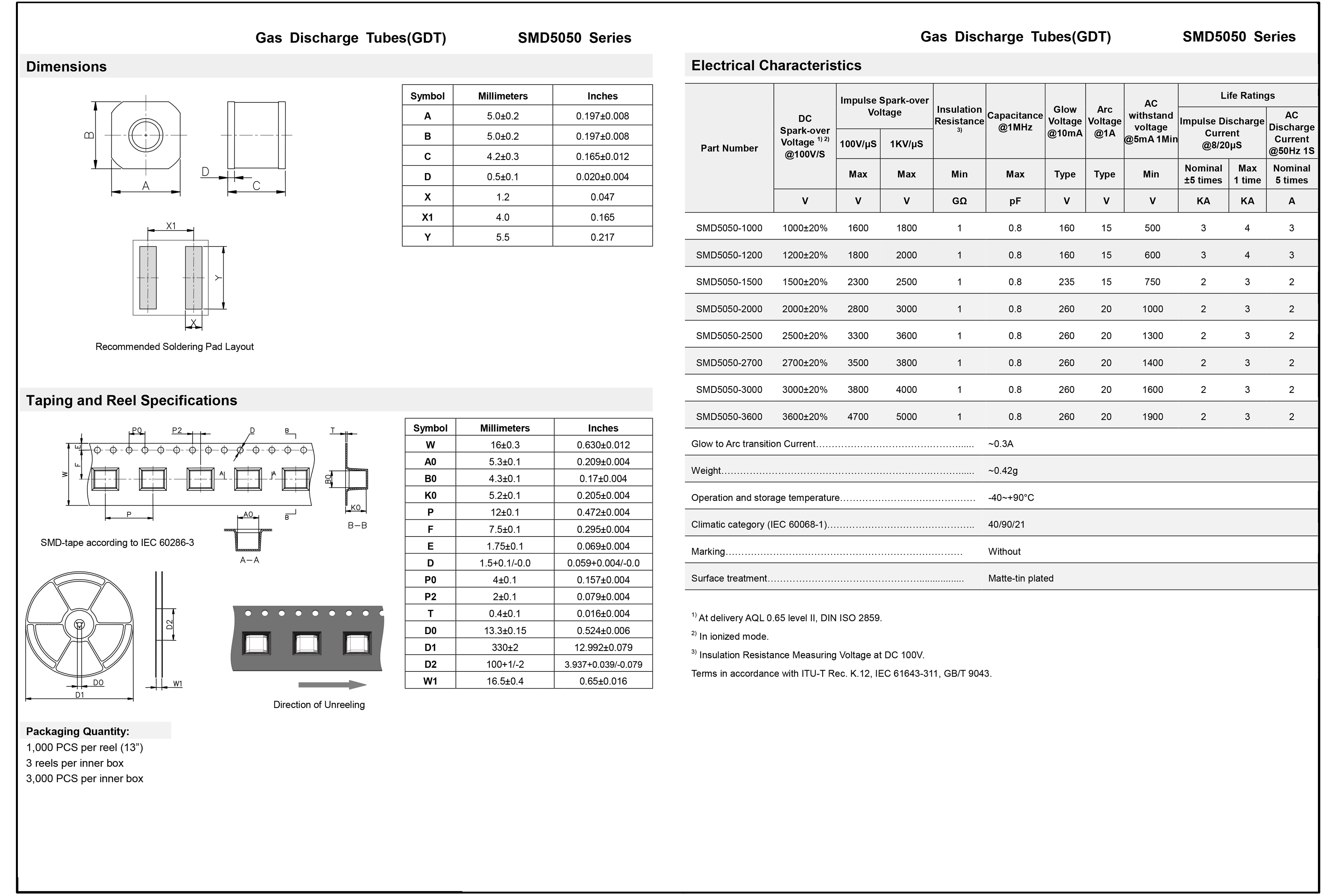 8/20μ脉冲电流容量:3KA/2KA,非放射性