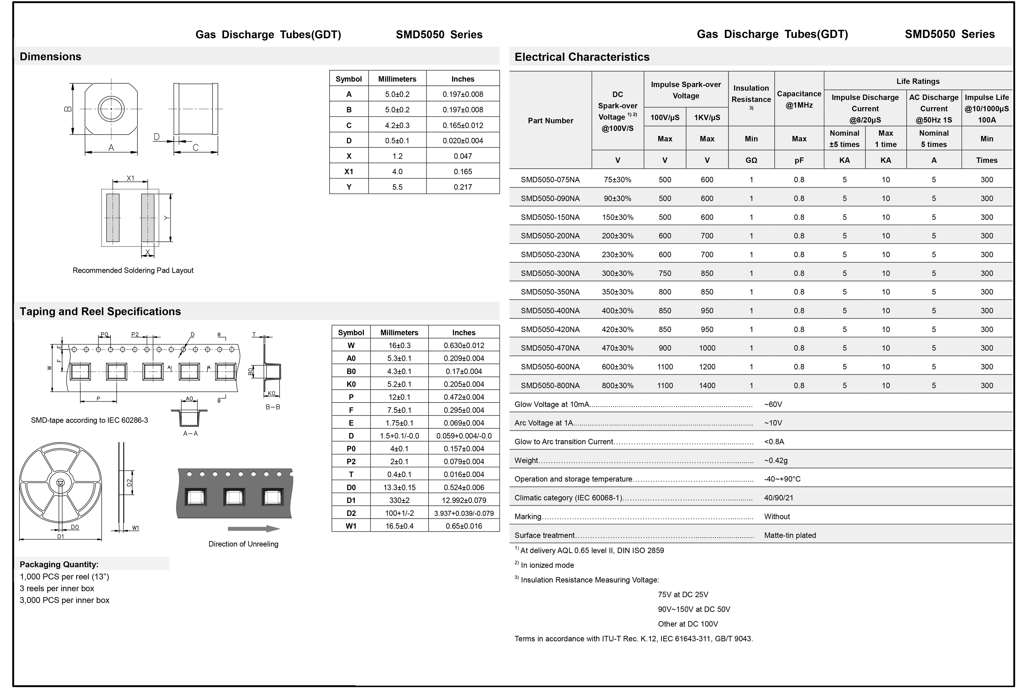 8/20μ脉冲电流容量:10KA,表面安装包装