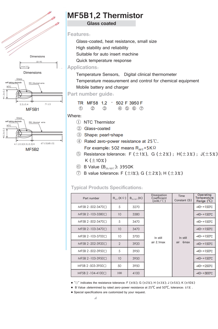 型号:MF5B1,2B值:3600 3950 4000 4050 阻值:1K-200KΩ 工作温度:-40~+125℃ 产品特性:体积小 精度高