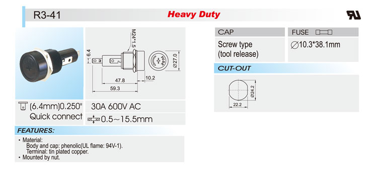 10*38面板安装保险丝座 R3-41 UL CSA 30A600V