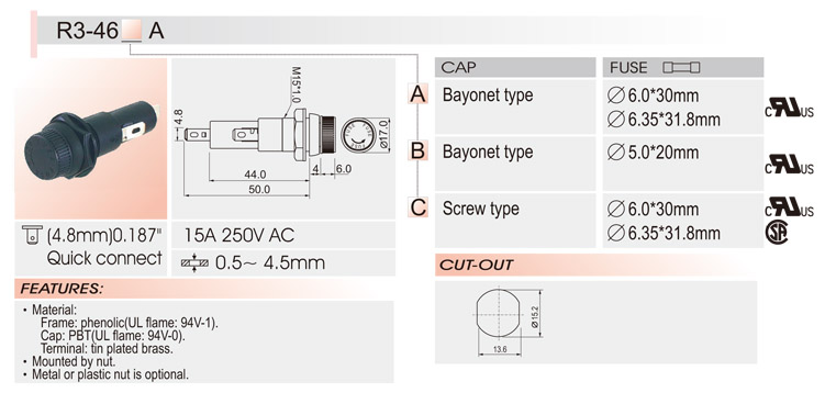 5*20/6*30面板安装保险丝座 R3-46 UL CSA 1250V