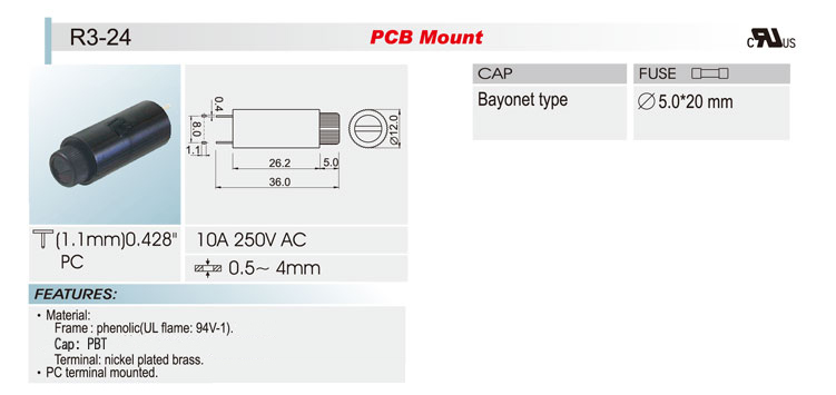 5*20 PCB安装保险丝座 R3-24 UL CSA 10A250V