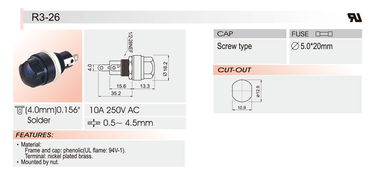 5*20 面板安装保险丝座 R3-26 UL CSA 10A250V