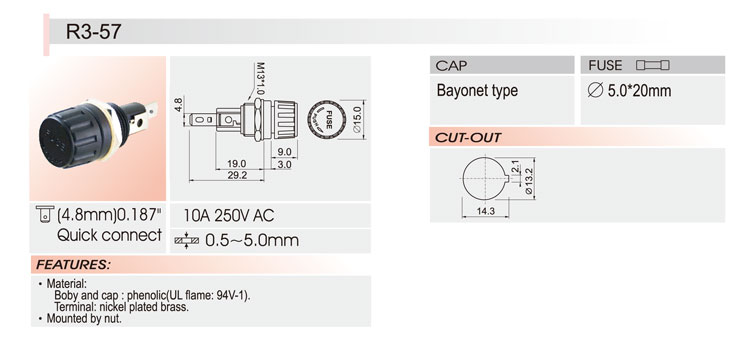 5*20面板安装保险丝座 R3-57 UL CSA 10A250V