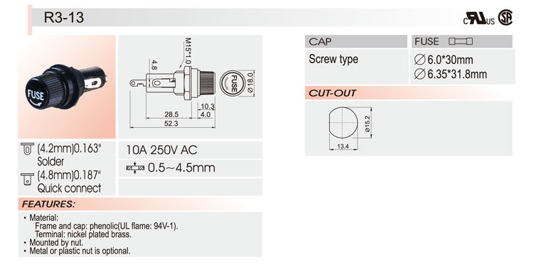 6*30面板安装保险丝座 R3-13 UL CSA 10A250V