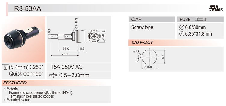 6*30面板安装保险丝座 R3-53 UL CSA 1250V
