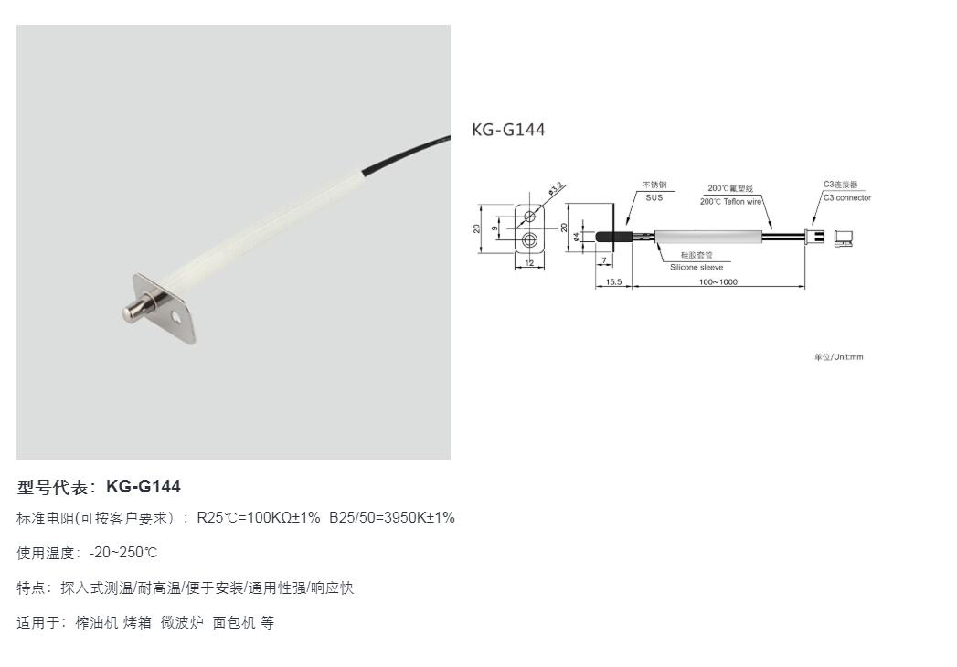 T型NTC温度传感器型号代表:KG-G144标准电阻(可按客户要求):R25℃=100KΩ±1% B25/50=3950K±1%使用温度:-20~250℃特点:探入式测温/耐高温/便于安装/通用性强/响应快