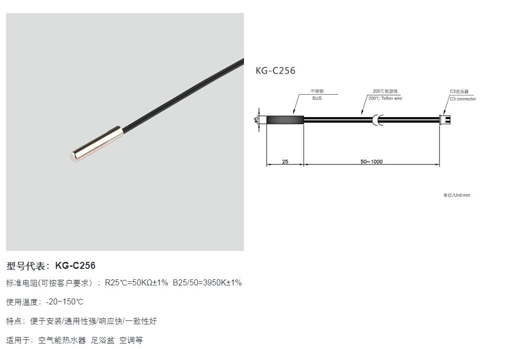 标准电阻(可按客户要求):R25℃=50KΩ±1%  B25/50=3950K±1%